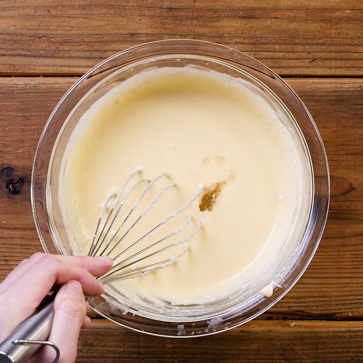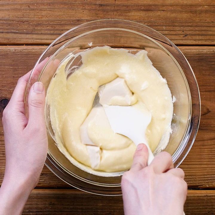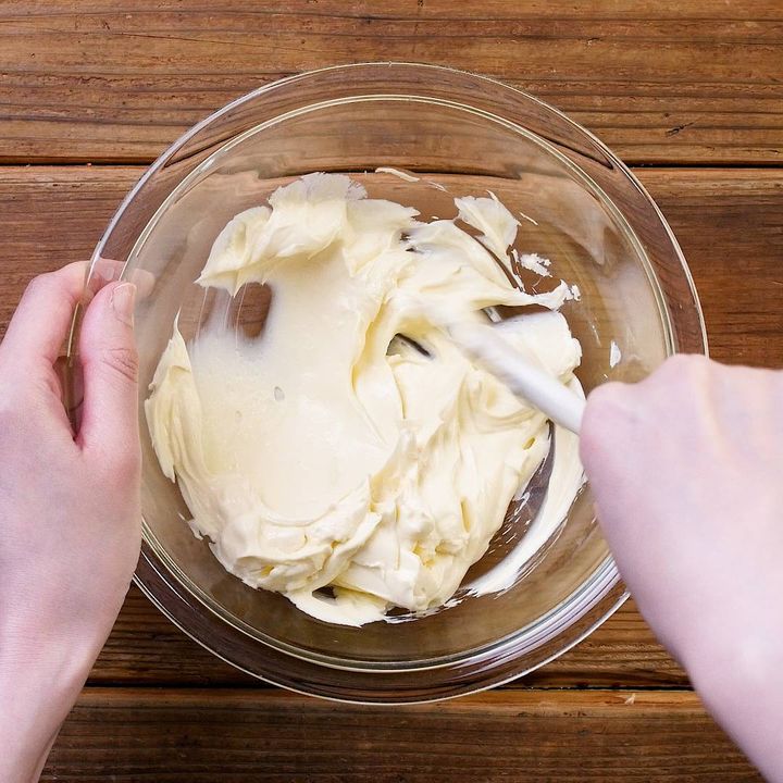 1: ボウルにクリームチーズを入れて、なめらかになるまでゴムベラで混ぜます。