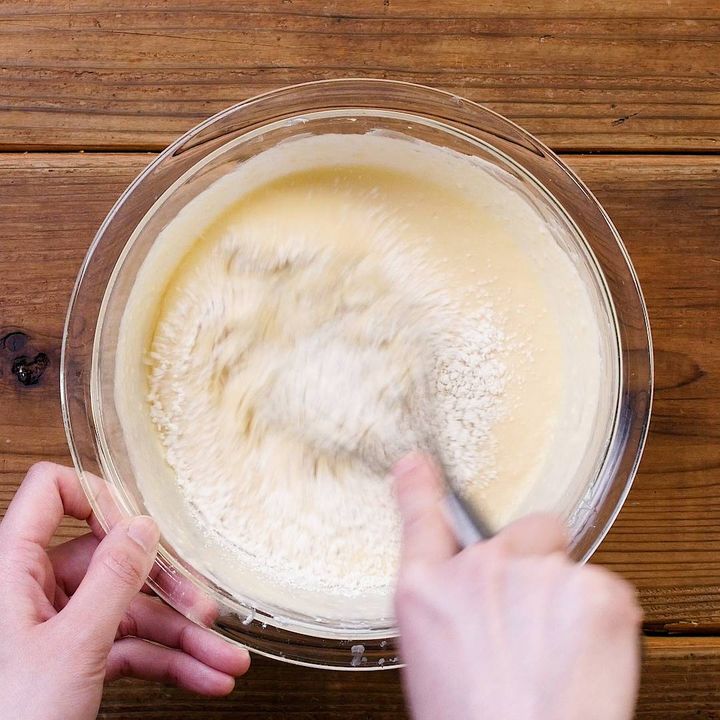 3: 卵を加えて混ぜ合わせたら、薄力粉をふるい入れて粉気がなくなるまで混ぜます。