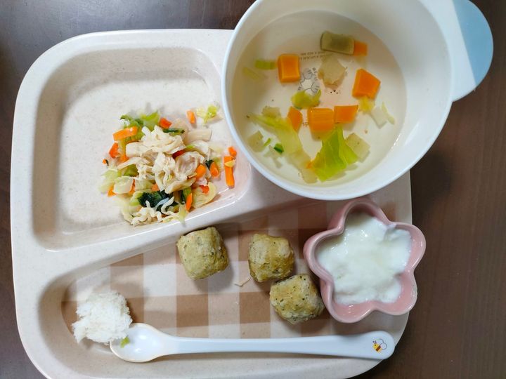 ・子ども:食パン、鶏団子、人参・キャベツとささみのマヨネーズ和え、人参とキャベツのコンソメスープ、ヨーグルト