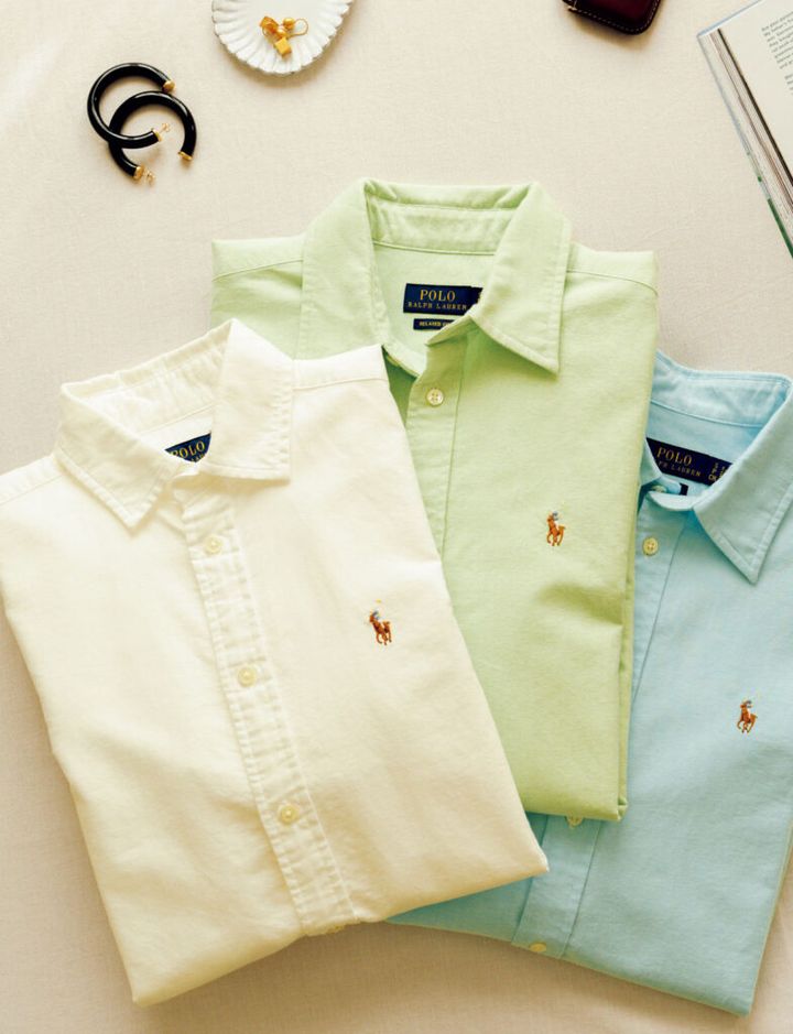 「今日はどの色にしよう」とカラー違いを揃えて選べるのも、スタンダードなアイテムの魅力。〈ポロ ラルフ ローレン〉のオックスフォードシャツもそんな一枚だ。着るごとにより心地よくフィットする生地感と、胸元にあしらわれたマルチカラーのポニーの刺繍。襟元のボタンをいくつ留めるか、袖をどれくらいまくるか、タックインするか……、毎度着こなし方を考えたくなって、それもまた変わらない定番の良さ。シャツ各¥22,000(ポロ ラルフ ローレン/ラルフ ローレン 0120−3274−20) その他スタイリスト私物