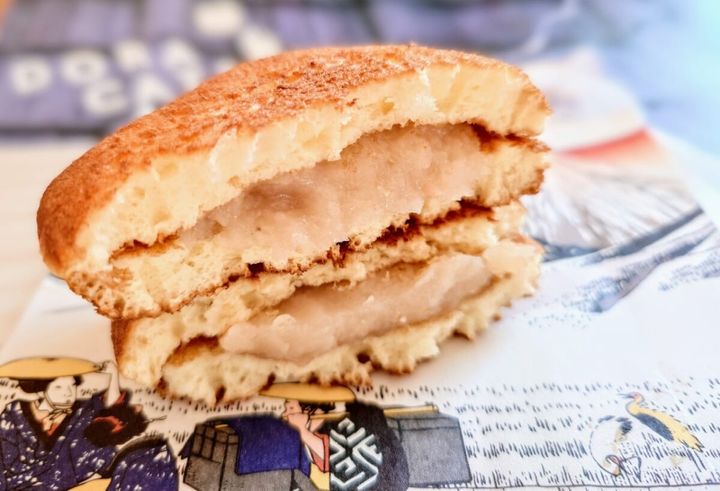 皮がふわふわもちもち食感がたまらない! 角切りりんごがシャキシャキと弾み、餡はジューシーで甘酸っぱく、シナモンの香りで大人味に仕上げています! レンジで少し温めたり、パンケーキのようにアイスをのせたりしてリッチなアレンジもできますね。