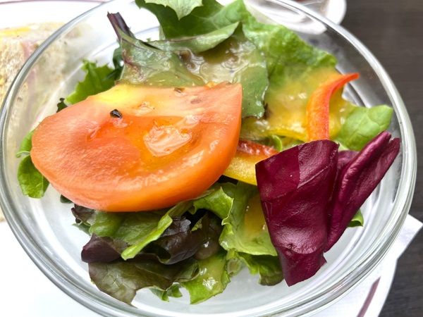 サラダはレタスやトマト、パプリカと野菜の種類が豊富なのも嬉しかったです。ちなみに運ばれてくるときにドレッシングも付いてきたのですが、そのドレッシングがコージーコーナーオリジナルだったことも驚きました。