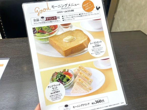 コージーコーナーのモーニングはシンプルな「トーストセット」(ドリンク込み550円)と「サンドウィッチセット」(ドリンク込み650円)の2つ。ちなみに以前までホットケーキやプリンなどのスイーツ系メニューのメニューもあったそうですが、現在はこちらの2種類のみの展開となっているそうです。