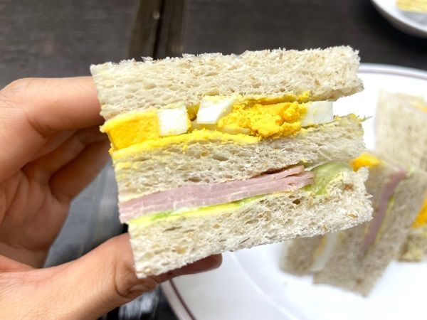 サンドウィッチはハムとレタス、そしてたまごの2つの味が楽しめるようになっていました。普通の食パンではなく胚芽パンのように少し茶色かったです。しっとりとしたパンにたまごのコク、たっぷりのハムとシャキシャキのレタスはシンプルな組み合わせですが間違いないおいしさ! 朝でも食べやすいです。