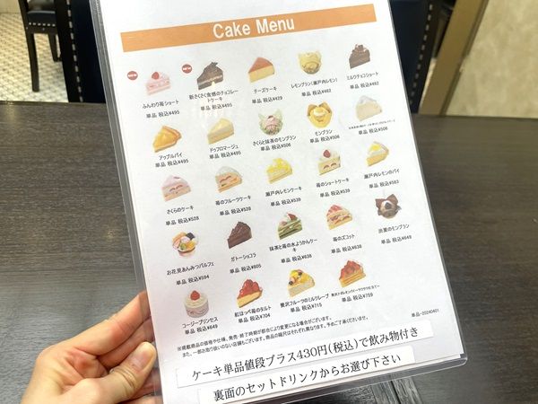 またカフェ限定のケーキを食べることができるのがコージーコーナーのカフェの魅力。もちろんモーニングの時間帯もOK。ケーキ単品の値段に+430円で飲み物を付けることができます。