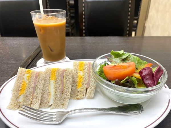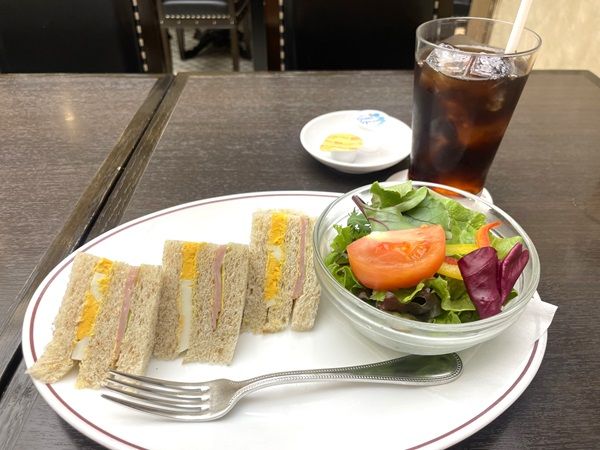 ということで「サンドウィッチセット」(ドリンク込み650円)を注文してみました。食べやすいサイズにカットされたサンドウィッチ3切れとサラダ、そして好きなドリンクが付いて650円はなかなかお得です。