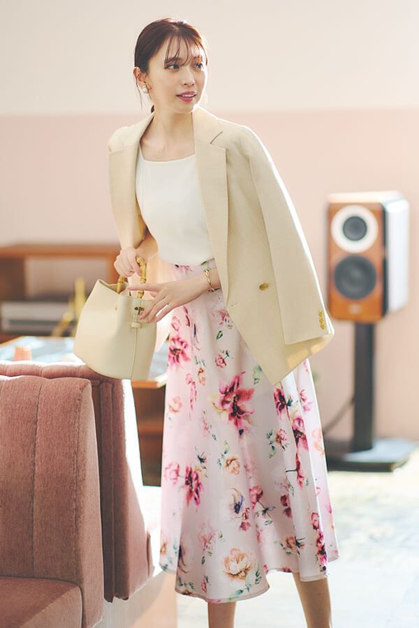 ピンクベースに載せた花柄のキュートさをコンサバなジャケットで引き算。まろやかなクリームカラーを合わせれば、かっちりしすぎず優しげな印象。