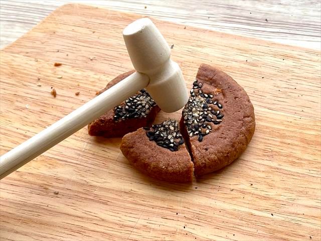 筆者は意地になって最後まで木槌を使いましたが、かたやき1枚を手に取り、もう1枚を直角に打ち付けるやり方だと割りやすいですよ。