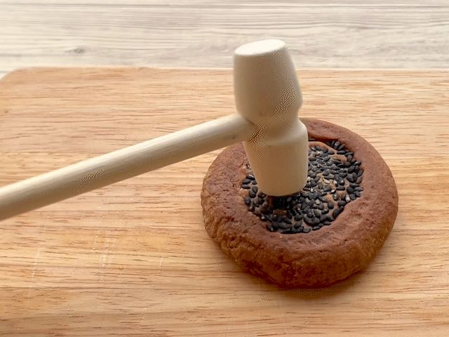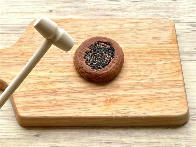 また、種類もごま味のほか、青のり・黒胡麻・ピーナッツ・くるみ・アーモンドの6種類で展開。木槌同封のあるなし以外にも、製法は同じながら食べやすい薄さの「うす焼き」や、忍者由来の手裏剣型「手裏剣かたやき」といったバリエーションも豊富な様子。