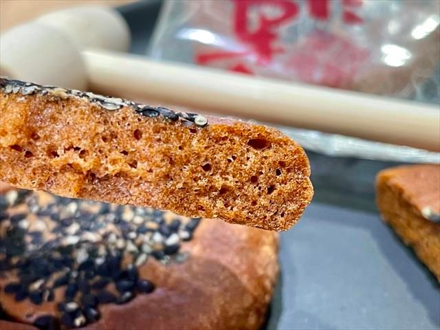 口に入れると、まずゴマの香ばしさと風味がしっかり感じられます。その後、焼いた小麦とお砂糖の甘みがじんわりと広がりました。ハードな食感とは裏腹の、やさしい甘さで素朴なおいしさ! 原材料は三重県産の小麦と、砂糖、ゴマの3つだけなのだから納得です。