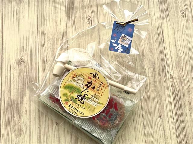 しかし何と言っても一番の特徴は、かたやきを砕き割って食べるための木槌も付属していること! 食べ物を購入してハンマーが付いてくるのは、さすがに初めての体験です。