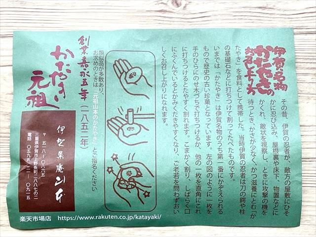 曰く、「その昔、伊賀の忍者が、敵方の屋敷にひそかに忍び込み、屋根裏や床下、物置などにかくれ、敵状を視察し、ときに攻撃の機を待つとき、かさが少なく、かつ滋養にとむ「かたやき」を食料として携帯した」のだそう! そこから転じて、現代まで三重銘菓として伝わっているんですね。