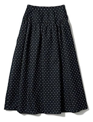 小粒のドット柄刺しゅうで黒スカートに愛嬌がプラス。ほどよく厚みのある高級感あるジャカード地はきちんと見えてオフィスにもおすすめ。