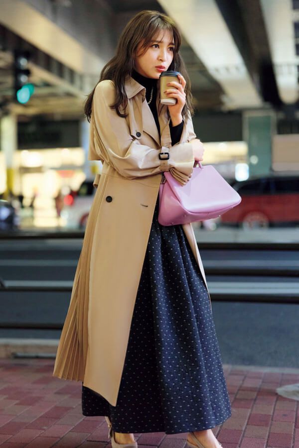 春の雨のあとは少し気温が下がりやすい傾向が。そんな日はフェミニンなディテールのトレンチをお供にして。ブラックコーデにパールアクセを添え、パリっぽい気品をひとさじ。
