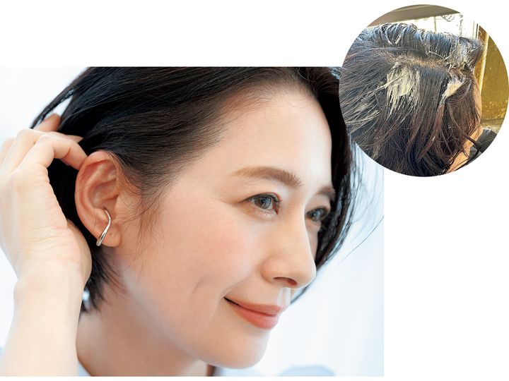 40代のチラホラ白髪は全部を白髪用カラーで染めるとベタッと暗くなってもったいない。白髪の部分だけを狙ってグレーヘアカラーを。