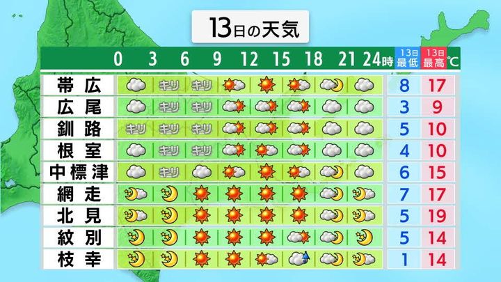 15日(月)も晴れて、上川地方やオホーツク海側の内陸では、道内今年初めて、最高気温が25度以上の夏日になる可能性があります。