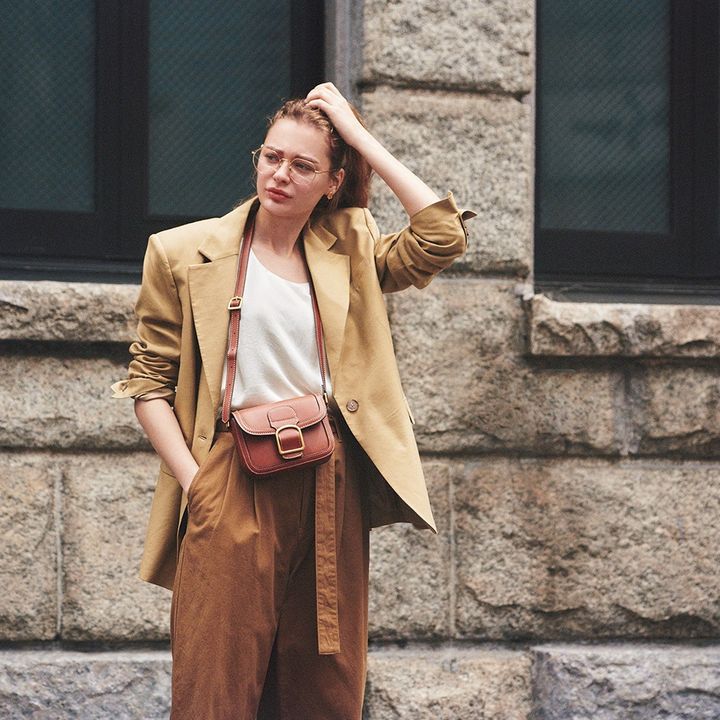 パリッと端正な見た目のジャケットにベルトをたらしたようなラフなチノを合わせて、キレイとカジュアルをMIX。それぞれの「まじめすぎる」「リラックスしすぎる」悩みを打ち消しあい、背筋の伸びたキレイめカジュアルに好転。クラシカルなレザーバッグで引き締め、レディをひとさじ。