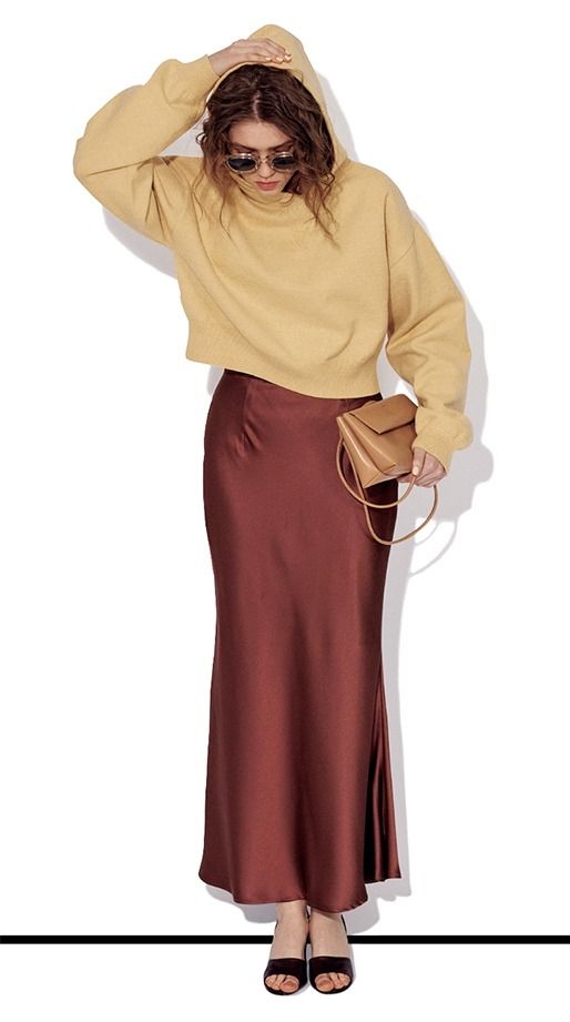 イエローフーディーニット 15,290円、ブラウンサテンロングスカート 13,200円/ともにSeaRoomlynn サングラス 41,800円/アヤメ ベージュバッグ 26,950円/ヤーキ(ヤーキ オンラインストア) サンダル 33,000円/エディット フォー ルル 糖度の高い色合いは、コンパクトな形でキレを維持。