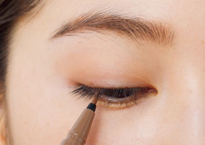 明るいブラウンのBを使用。下からまつ毛の根元に差し込むように隙間を埋めて。
