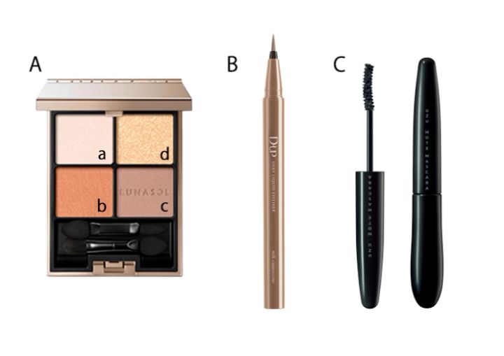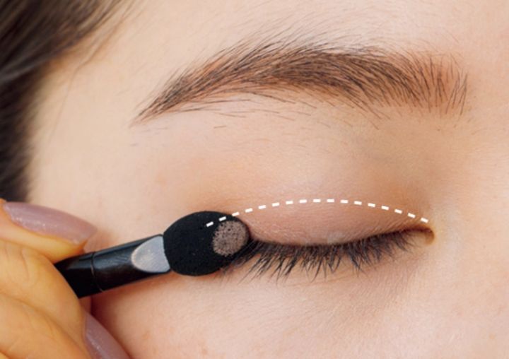 Aの締め色cをチップにとり、二重幅を少し超える範囲に重ねて目元を引き締める。