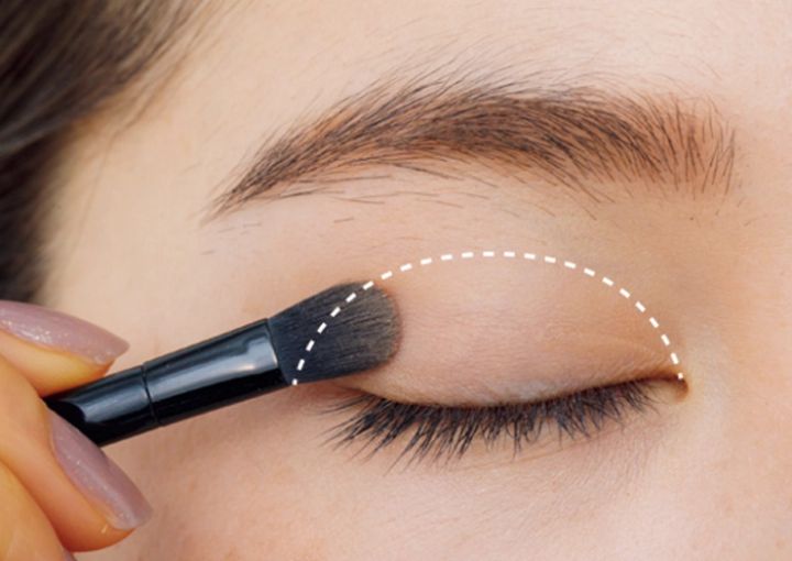 Aのa+bをブラシで混ぜとり淡いベージュを作ったら、アイホール全体に広げる。