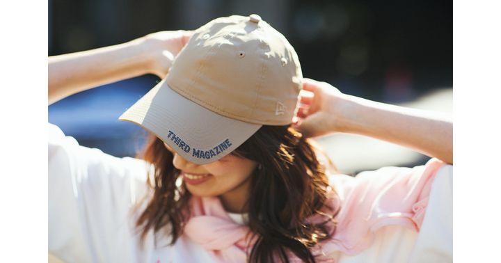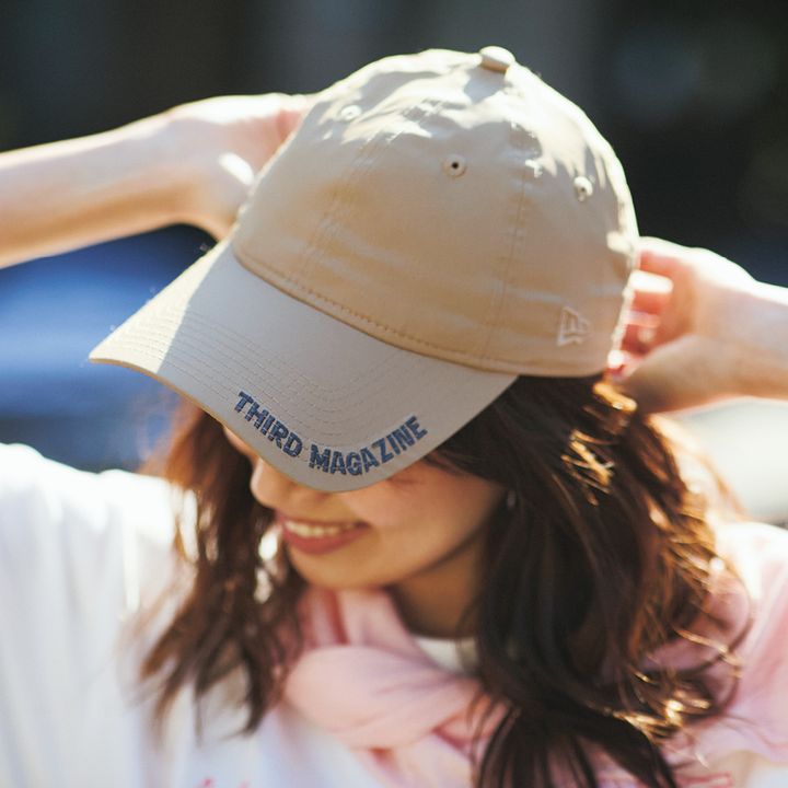 キャップ各¥4,950(ともにサードマガジン×ニューエラ/サードマガジン)Tシャツ¥10,450〈サードマガジン〉肩にかけたトップス¥15,400〈ナインティー パーセント〉(すべてサードマガジン)