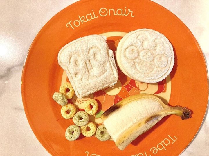 お子さんのお皿にはキャラクターの型抜きがされたチーズ入りのサンドイッチ。一方でバビチョさんのお皿にはサンドイッチを作った時の余りだと思われる食パンの耳やパンの切れ端とチーズが載っています。
