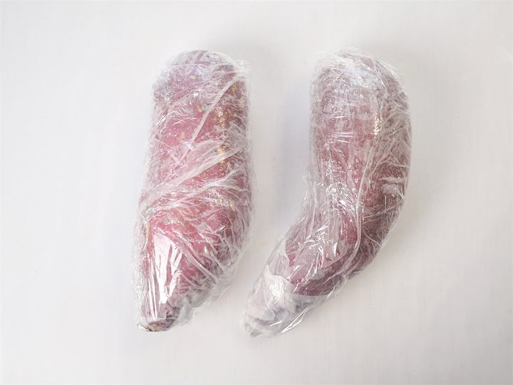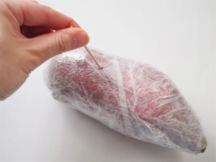 1.さつまいもをよく洗い、水で濡らしたペーパータオルでくるみ更にラップで包んだら、600wの電子レンジで約2分間加熱する。その後、200w or 300wで10~15分ほど加熱していく。