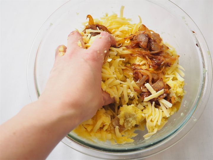 4.1のさつまいもの皮をむき、輪切りにしてボウルに入れる。マッシュしながら、牛乳、シュレッドチーズ、3の玉ねぎを加え、よく混ぜていく。