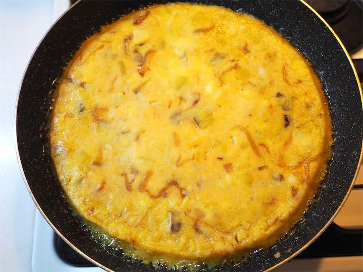 5.3の玉ねぎで使っていたフライパンにオリーブオイルを多めに入れ弱火にかけ、4を入れて平たい円形に成形していく。