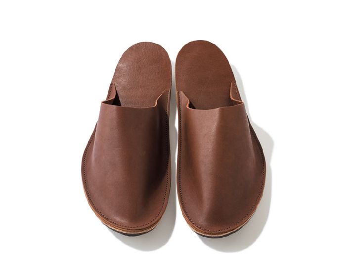 使うほどに味わいを増す、レザーのルームシューズ。2枚の革で構成されたシンプルなつくりで、インテリアに馴染む落ち着いた佇まい。柔らかな質感も持ち味で、使い始めから心地よく履ける。¥15,400(LOG TEL:0848・24・6669)
