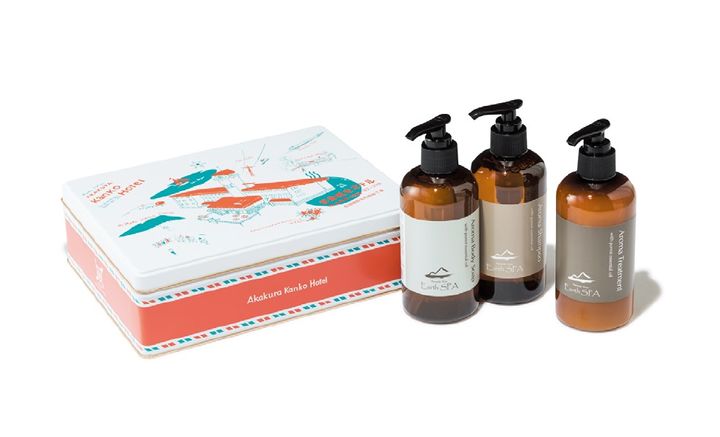 ホテル内の『アース スパ』オリジナルのシャンプー、トリートメント、ボディソープ(各250ml)がセットに。缶には、数々のホテルで美術担当として活躍した、繁岡ケンイチの絵を採用。¥6,435(赤倉観光ホテル)