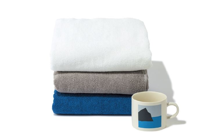海辺で使うことをイメージして作られたタオルは、つぶつぶのパイルが特徴で、ソフトな風合いが続く。マグカップのロゴにも美しい海の風景が。バスタオル145×71cm 各¥3,960 マグカップ¥1,980(bbb haus)