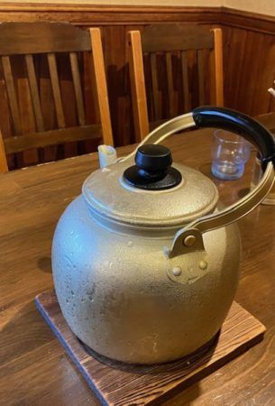 ガラスの電球カバーに木の温もり、そしてやかん。やかんは麦茶…ではなくお水でした。
