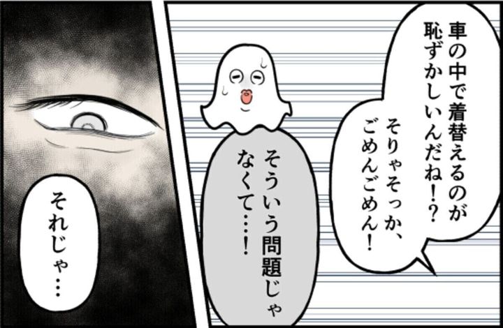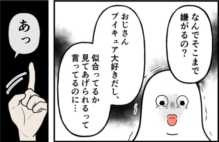 逃げなきゃ」と思いながらも、えたいの知れない不気味さを感じ取り、体が動きません。男性を怒らせないよう、逃げるタイミングをうかがっていたところ、今度は「着替えて」と要求されます。「車の中で」と言われましたが拒絶すると、今度は「おじさんの家へ行こう」と言われてしまいました。