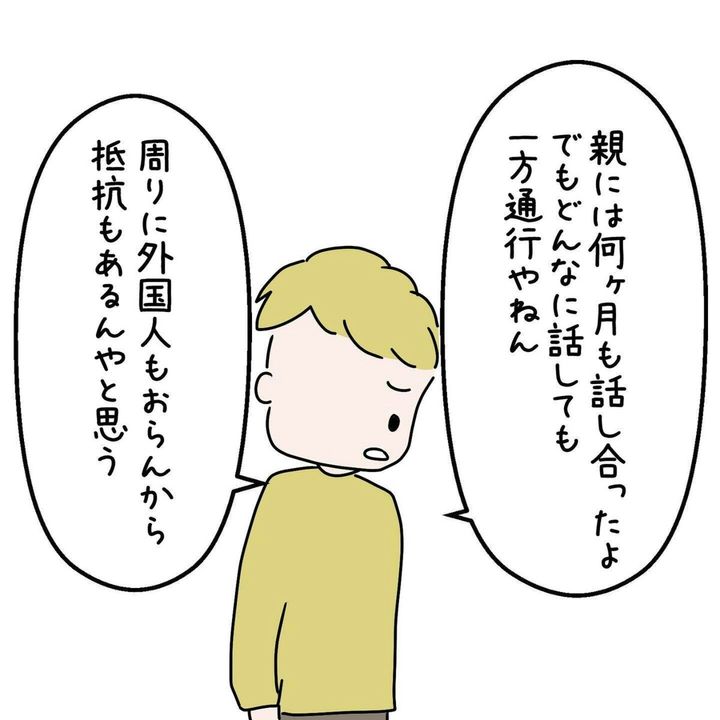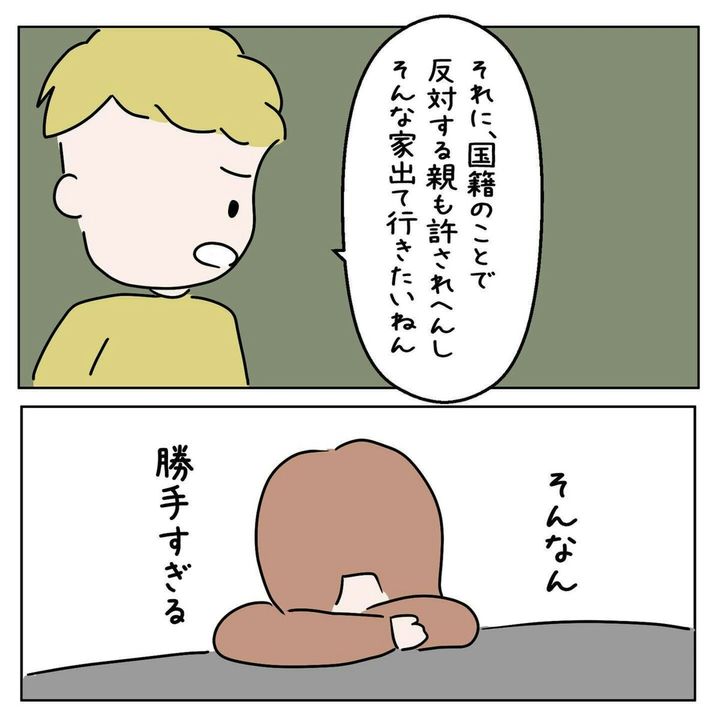 このお話は、著者・おとさん(@oto_ppu)によるエッセー作品です。国籍の違いから、恋人と破局しかけ、それを乗り越えた体験を描いています。学生時代に、国籍が原因で起こった数々のことは、おとさんの心の中にふたをしてしまいこんだはずでした。ですが、恋人の両親に国籍を変えてほしいと言われたことで、再びその痛みを伴う気持ちが心を満たしそうになります。これでは同棲はできません。『国籍問題で破局しかけた話』第10話をごらんください。