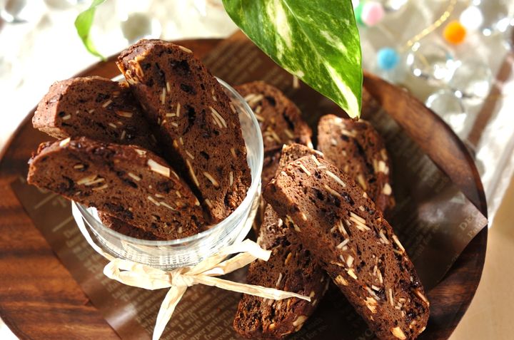 チョコレート風味のビスコッティは、コーヒーに浸すのがイチオシです。ココアパウダーも使うので、カカオの香りが堪能できますよ。断面がキレイで、プレゼントにもおすすめです。