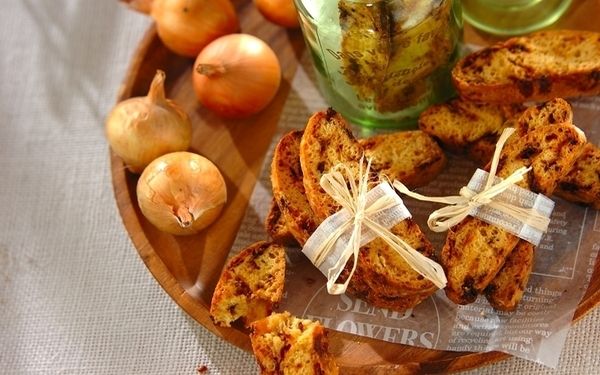 新玉ネギとベーコンを混ぜ込んだビスコッティは、塩気が効いていておかずやおつまみ感覚で食べられます。生地に強力粉やインスタントドライイーストを使い、発酵させるのが特徴。ザクザク感はありつつも硬すぎないので、そのまま食べても◎です。