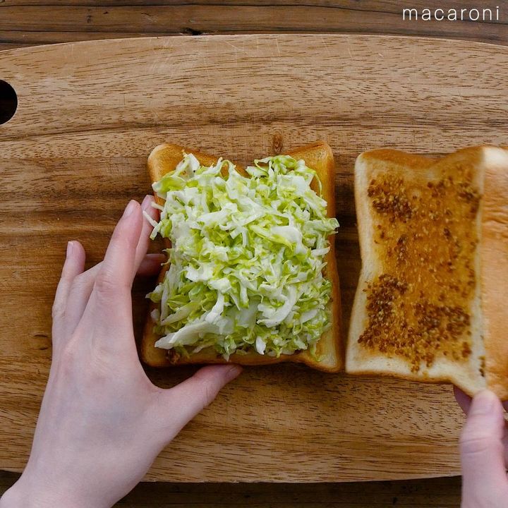 4: 1枚の食パンの上に③をのせ、もう1枚の食パンをのせてぎゅっと押さえます。