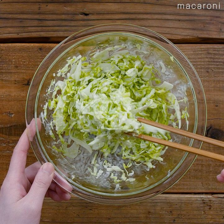 キャベツを塩揉みしたあと、水分が多く出てくるようでしたらキッチンペーパーでふき取ってください。