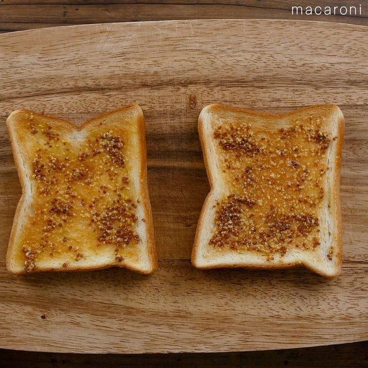 1: 食パンをトーストし、温かいうちにバターと粒マスタードを塗ります。