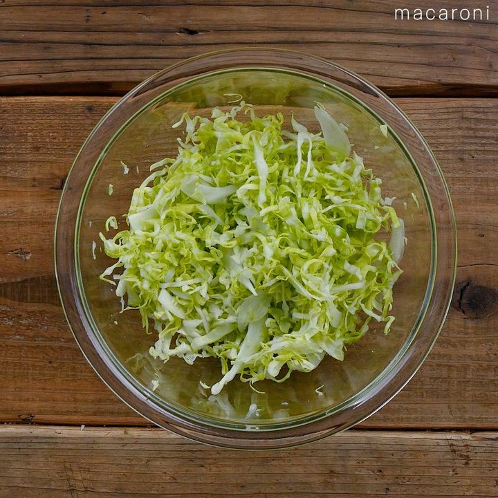 2: キャベツを千切りしてボウルに移し、塩を加えてよく揉み込みます。