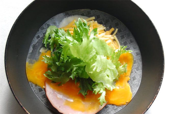 3.チーズとハムの真ん中あたりに生卵を割り入れます。