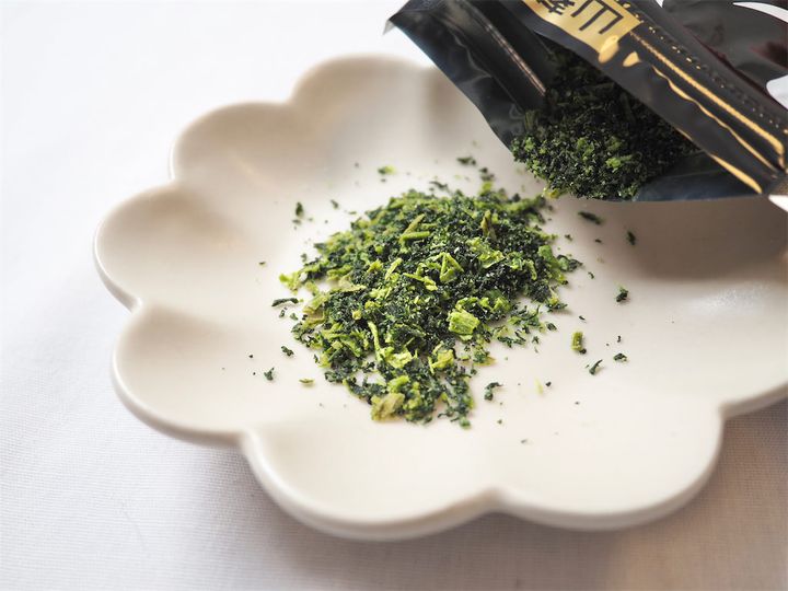 中身を出してみると、こんな感じ。一見青のりか⁉菜っぱなのか⁉って感じのふりかけ。実は大根葉、京菜、わさび葉という3種類の青菜をわさび味に仕上げているということです。袋の裏にも表にも警告マークの絵文字と共に「辛味が強い商品です」との注意書きが!“わさびのツーンとした辛味が刺激的なふりかけ“と書かれています。ここまで書かれていると少し身構えてしまいますね(笑)。
