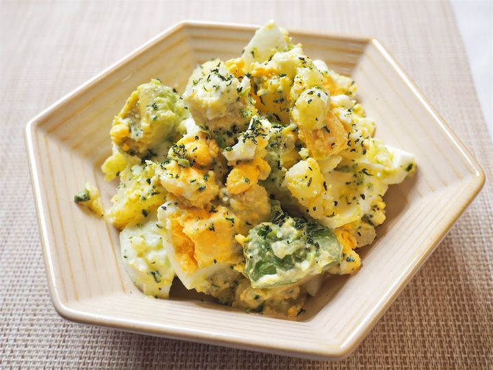 お次は和洋折衷のアレンジ。ゆで卵2個と蒸したじゃがいも1個を荒くつぶして、アボカド1/2個を角切りにしたものを加えます。そこへ、マヨネーズ適量と「しげき」を2つまみ加え混ぜたものをお皿に盛り、さらに1つまみの「しげき」をトッピングしてみました。クリーミーなポテトサラダに爽やかな辛さがアクセントになって、これはクセになる味わい♡