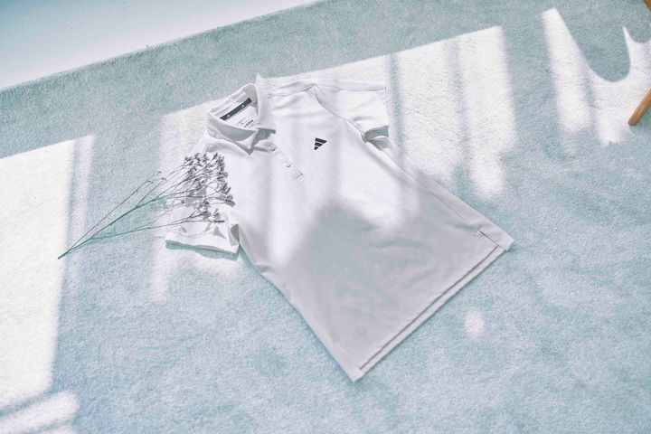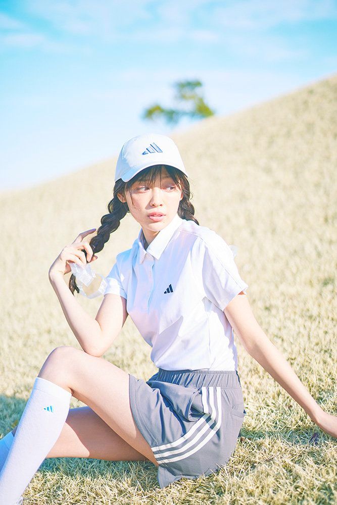 ポロシャツにスリーストライプスのミニを合わせた爽やかなスポーティールック。ALLホワイトの中にブラウンを投じることで、着こなしにほんのりコクが加わっておしゃれ度がぐぐっとUP。キャップもソックスも、シャツと同じロゴ入りデザインで揃えてゴルフ上級者を気取って。