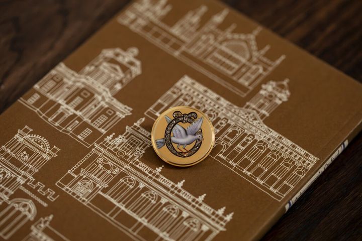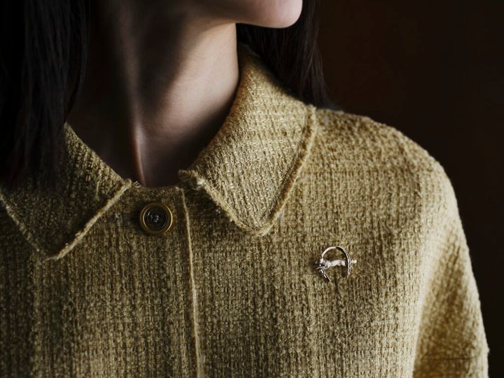 『tinycrown』の新作ジュエリーから。ゴールドのブローチは、イギリスのハンティング(狩猟)モチーフ。キツネが馬の蹄鉄をくぐっている躍動感溢れるデザインが魅力。photo&clothing : SAQUI