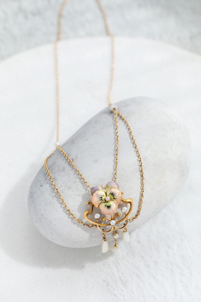 パンジーのエナメルの色と揺れるパールがエレガントな1900年前後のネックレス。