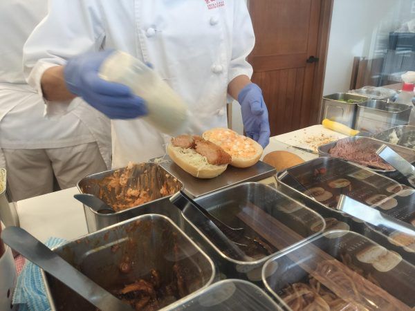白いコック帽のスタッフさんおふたりが、手際よくコッペパンを作ってくれます。目の前で行われる素早い調理に、ついつい見惚れてしまいました♪