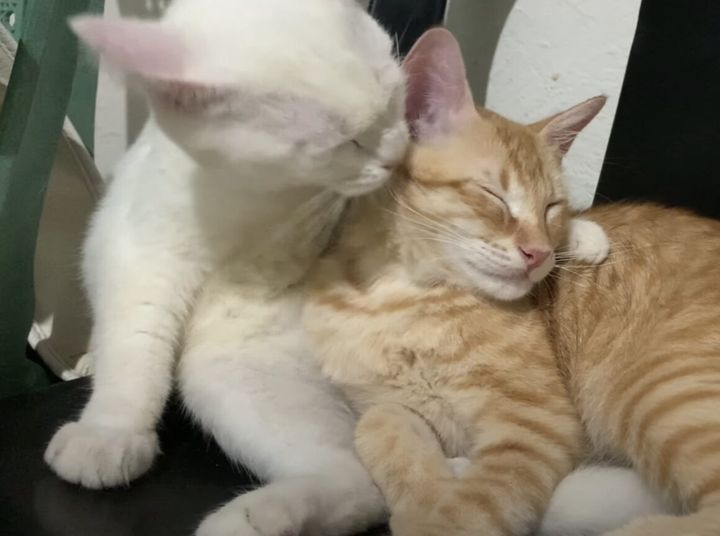 いつもお互いをキレイにしてあげる猫さん。 腕枕をしながら毛繕い♡